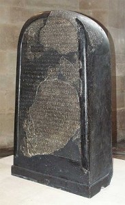 The ancient stele or tablet was discovered in the desert of Jordan in August 1868, The remarkable thing about this tablet, now on display in the Louve in Paris, is: